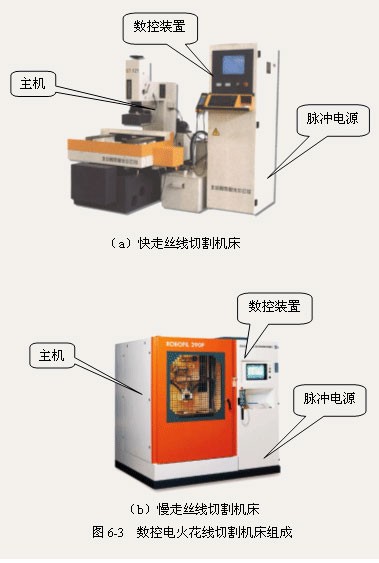 各种线切割机床的结构大同小异,图 6-3 示出了两种线切割机床的外观,可分为主机、脉冲电源和数控装置三大部分。